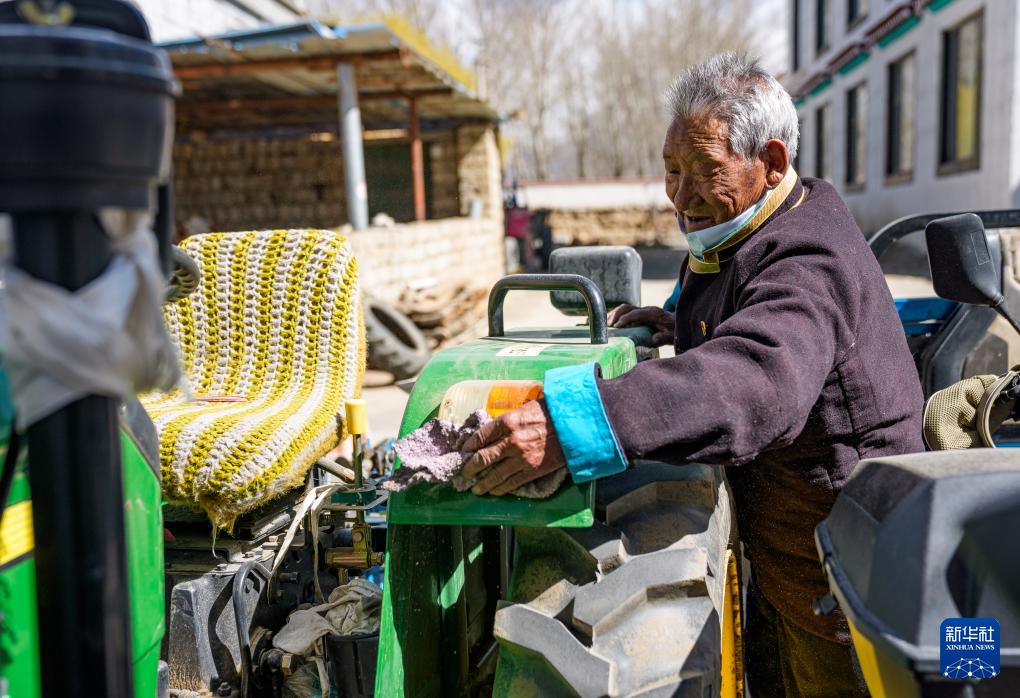 次仁桑珠在西藏山南市扎囊县桑耶镇的家中擦拭农机(3 月 25 日摄)。