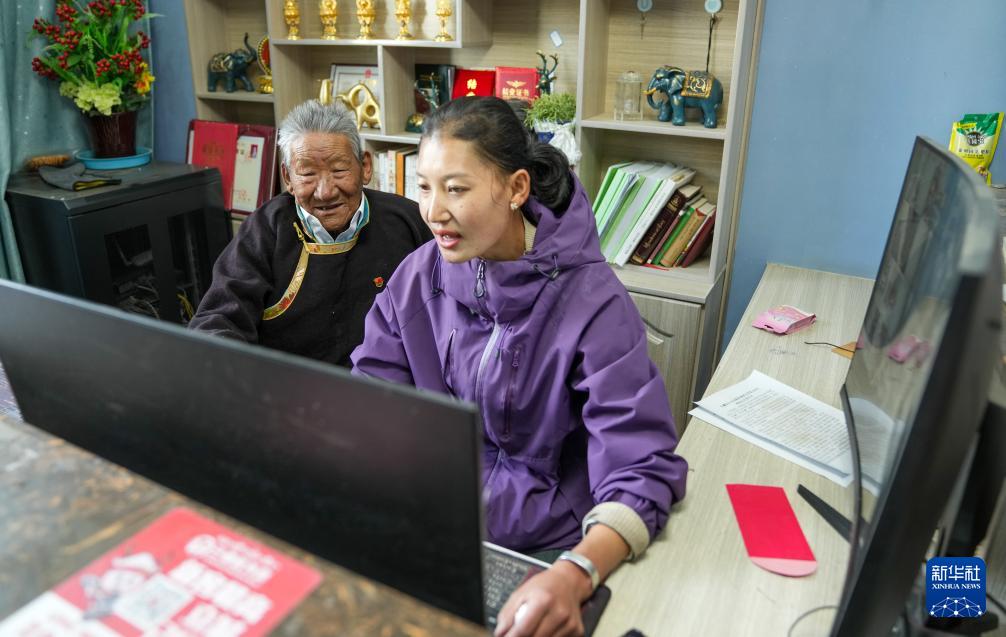次仁桑珠(左)和孙女在查看酒店入住情况(3 月 25 日摄)。