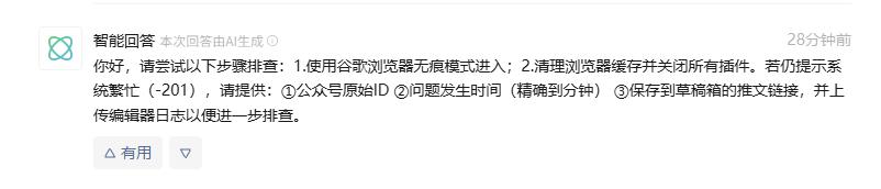 在微信开放社区,已有多位用户反映相同问题。有人发帖询问:" 公众号后台老显示系统繁忙 201,怎么办?" 也有用户具体描述:" 草稿箱点击报错【系统繁忙 ( -201 ) 】应该怎么解决?"。一位网友补充道:" 微信公众号平台其他功能都正常,唯独草稿箱进不去,换了浏览器登录也没用。"