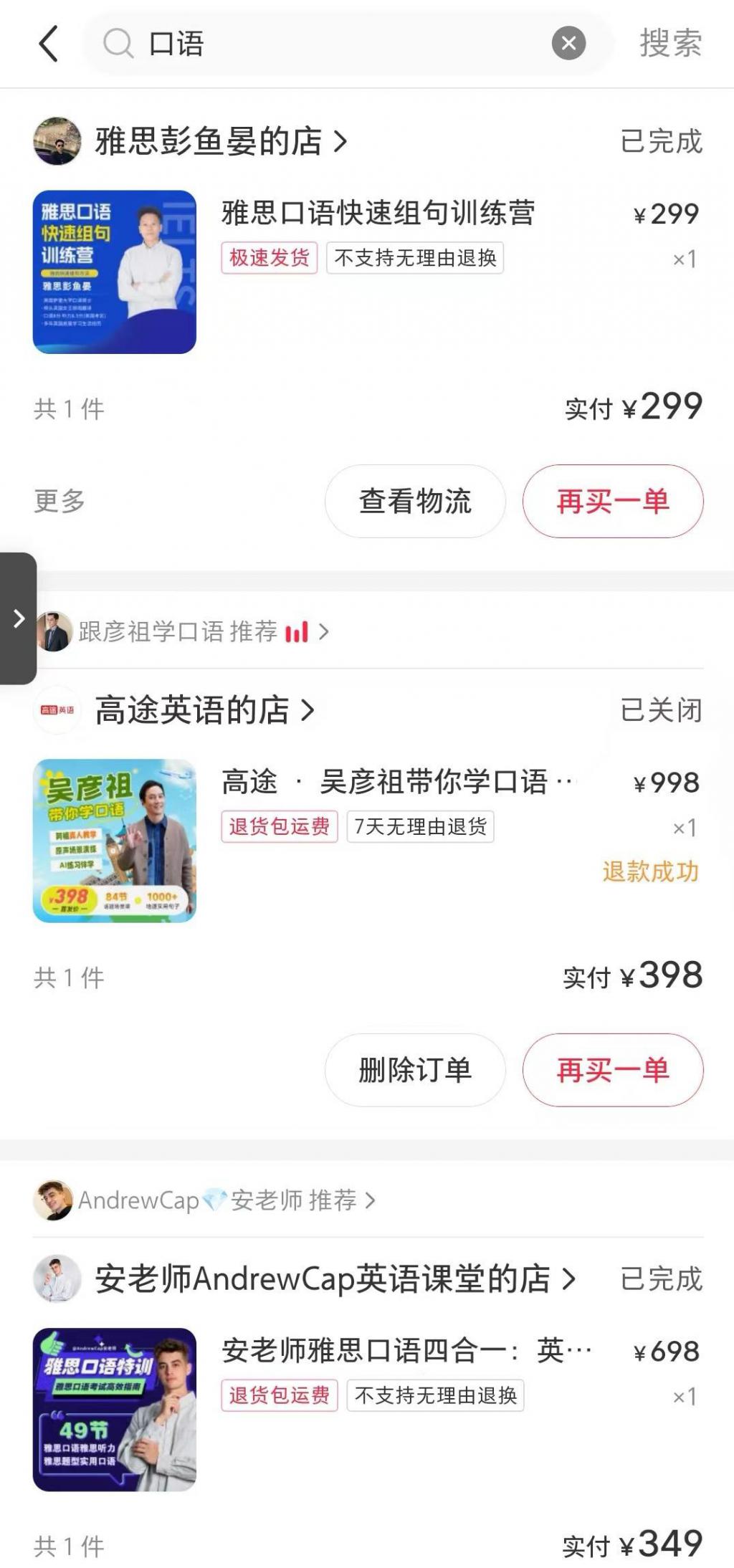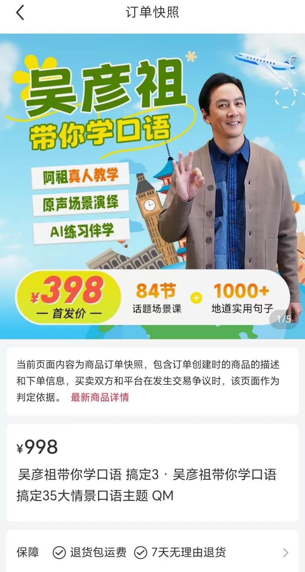 陈女士购买的吴彦祖口语课订单页面。 受访者供图