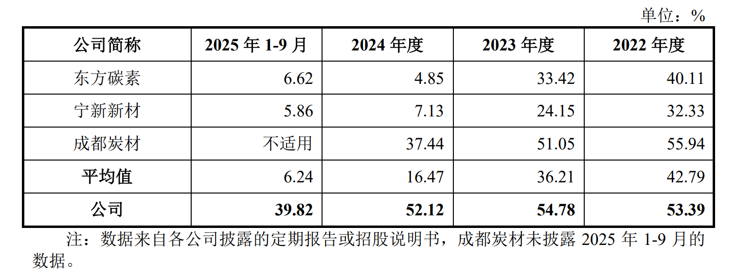 2025年前三季度,在同行可比公司(东方碳素、宁新新材等)平均毛利率为6.24%,五星新材的综合毛利率则为39.82%,是同行平均水平的5.38倍。这一差异较为罕见。五星新材解释称,差异源于“产品结构及应用领域不同”、“领先地位及品牌影响力”及“一焙一化”的先进工艺,但这仍难打消外界疑虑。