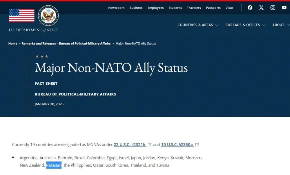 这个是清清楚楚写在美国国务院(外交部)网站上的,巴基斯坦是美国 19 个非北约主要盟友之一。