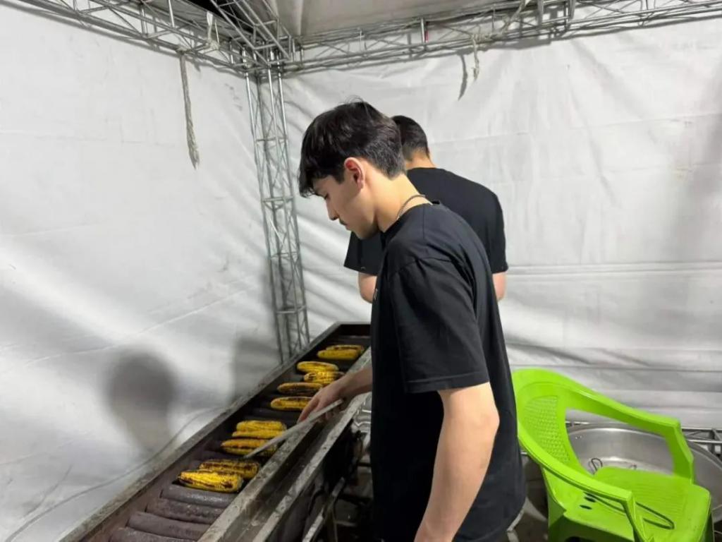 他把一个烤好的玉米递给排在前面的小男孩,小男孩香甜地吃着,还冲我笑了笑,很可爱。