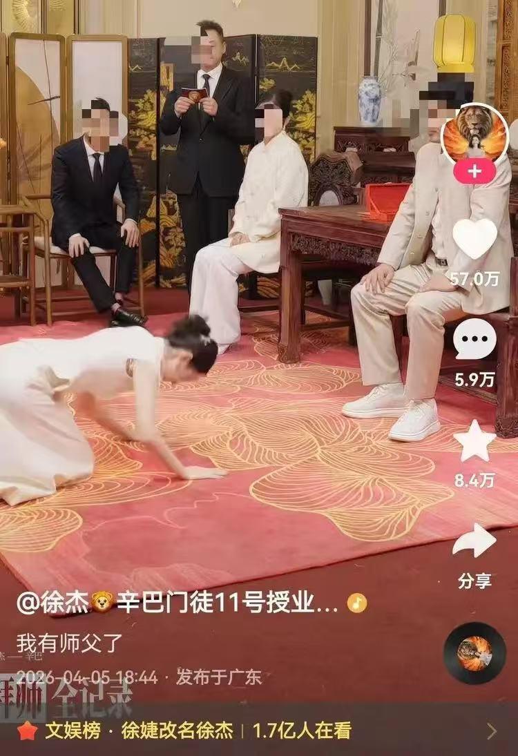 原本身为主播的徐婕当场改名徐杰,行跪拜大礼,正式拜入辛选门下。辛巴端坐太师椅,整个画面看起来就跟短剧一样。