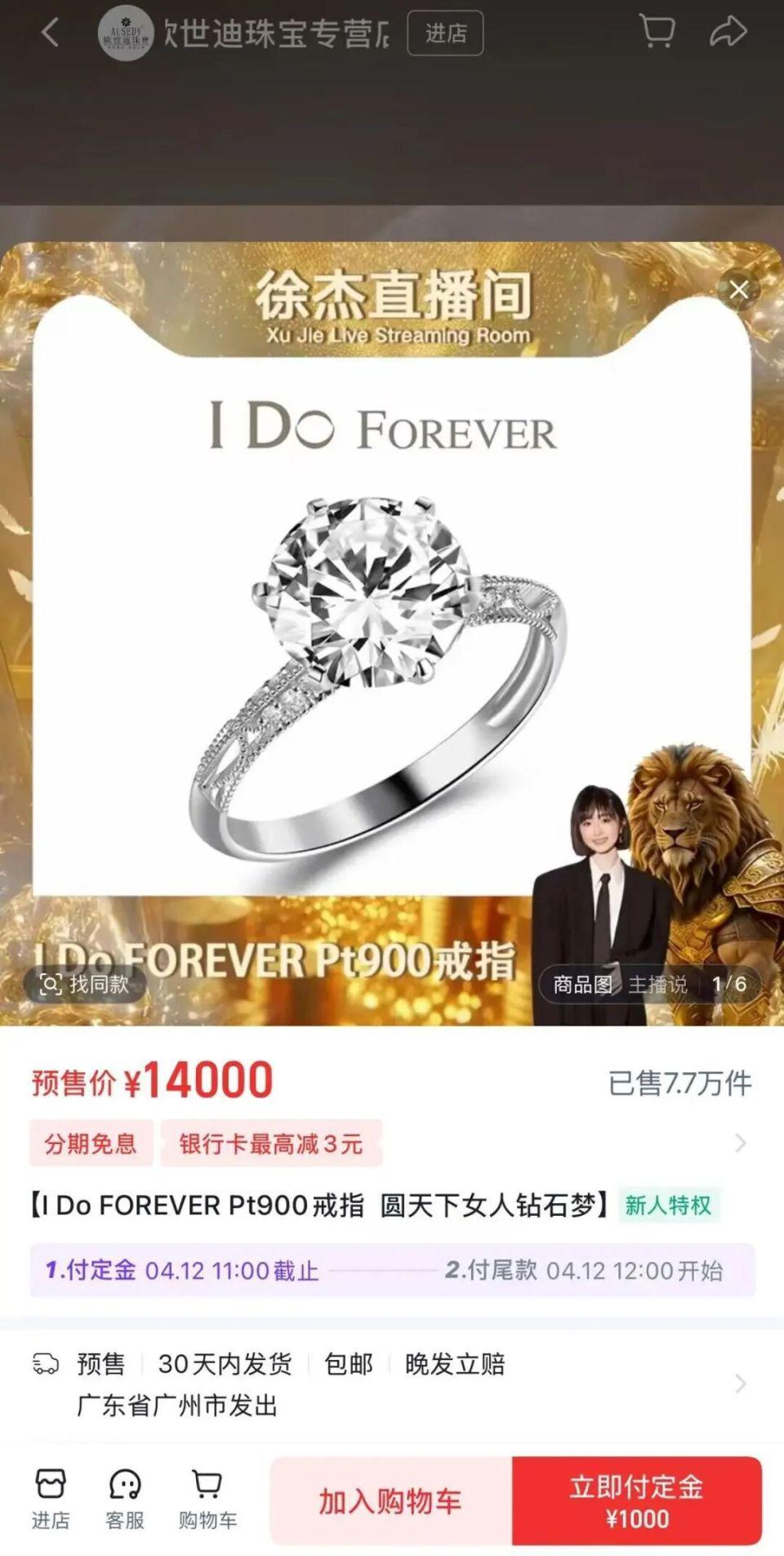 到了整场直播的高潮,卖的是一款标价 14000 元、券后 13800 元的钻戒。