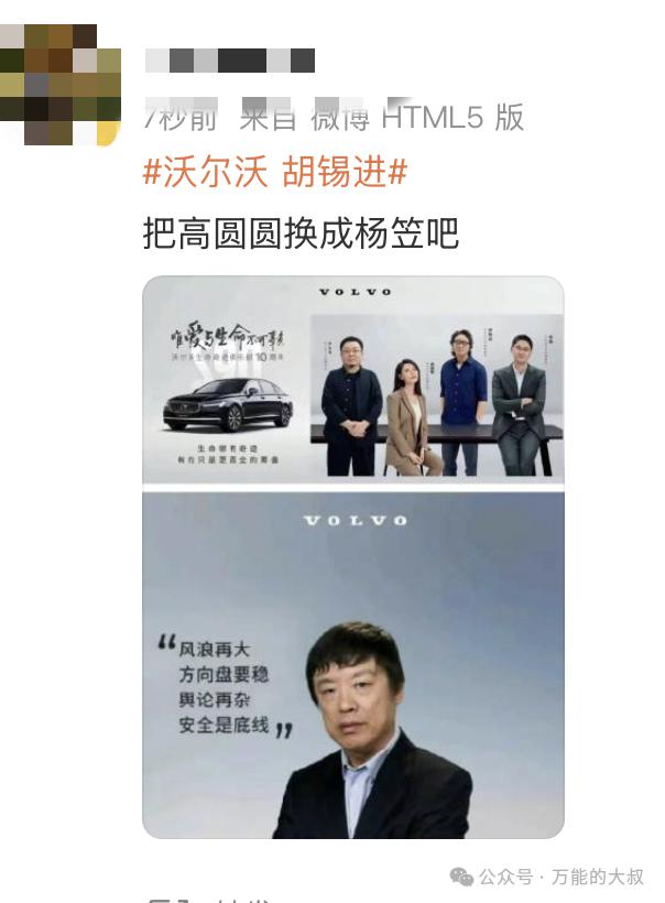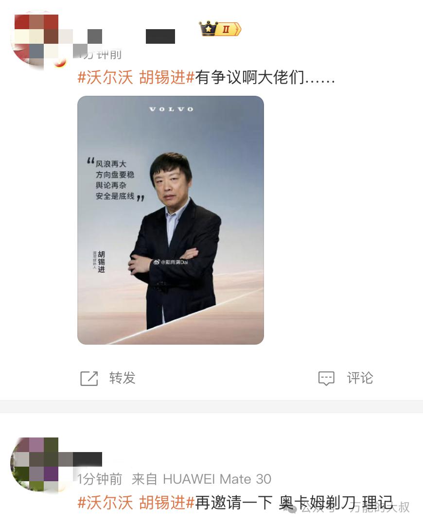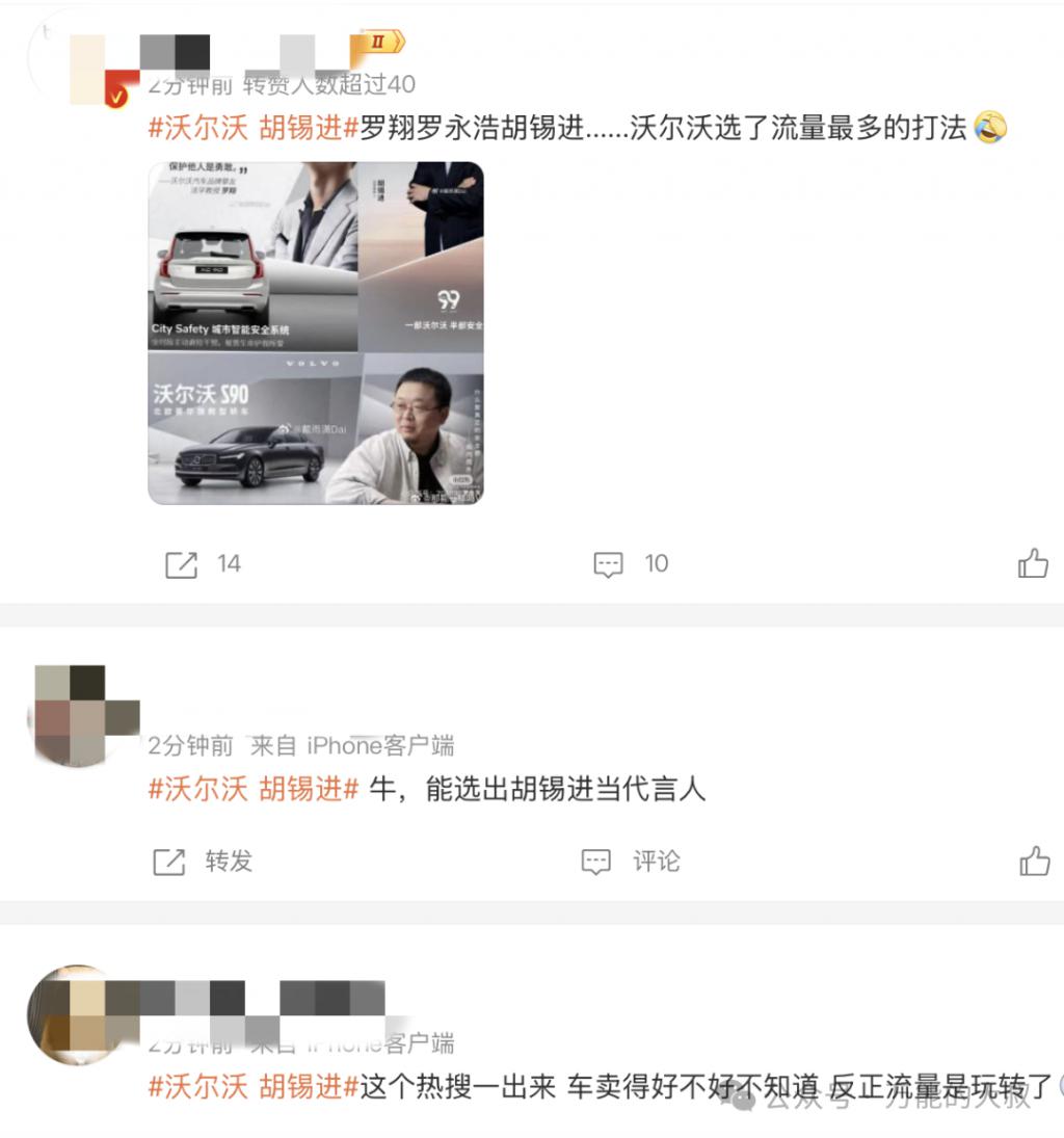 " 继罗翔、罗永浩之后,沃尔沃又选中了胡锡进,不知道该说什么好,沃尔沃公关部门绝对有 " 高人 ",中国舆论场三大顶流 KOL,居然同属一个汽车品牌,沃尔沃再次把 " 安全 " 的品牌溢价,传递给广大网友。" 某微博网友。
