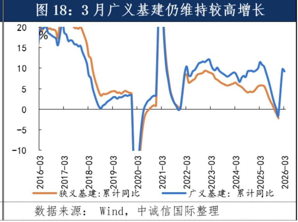 王青认为,今年一季度基建投资超预期增长,除了基建项目储备充分外,还因为今年国家单列并提高了用于项目建设的地方政府专项债券额度。这让一季度基建投资的资金来源更有保障。与此同时,2025 年 10 月 5000 亿新型政策性金融工具投放完毕,对基建投资的拉动效应也开始显现。