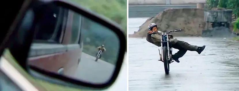 · 2006 年,张雪骑摩托车追逐电视台车辆,并在节目组前秀车技。(视频截图)