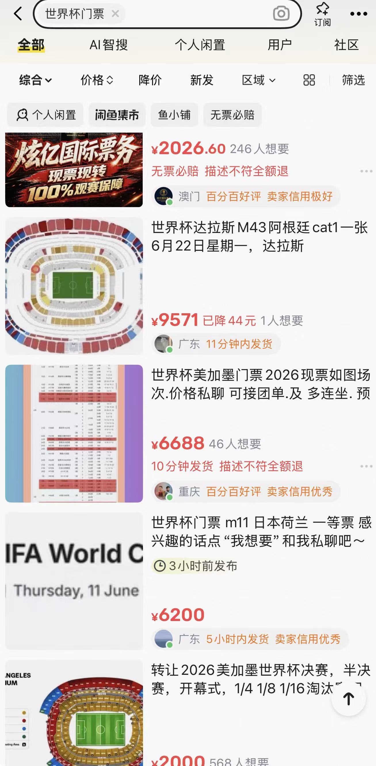在闲鱼,界面新闻也检索到不少二手转售票。售价从1000元到9600元不等。界面新闻联系的一位卖家告诉记者,其手上有一张622日在美国达拉斯Match43阿根廷cat1票。“我是现票,官方系统可以马上转,你收到票才需要点确认收货。转票过程我会全程拍视频并和你double check。”该卖主告诉界面新闻。