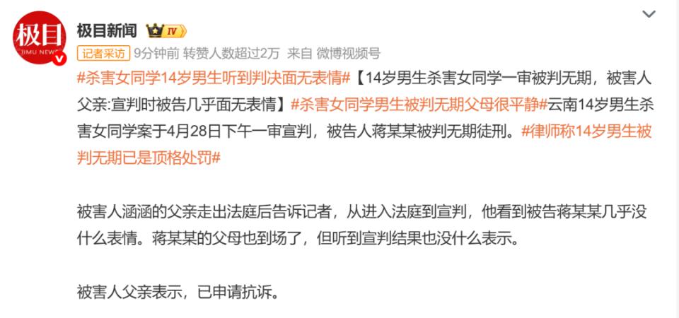 14岁少年杀害同班女同学被判无期,被害人家属:已当庭向检方提交抗诉材料