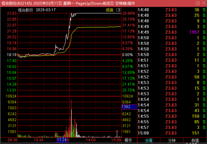 “中投风起扶摇五号”相关账户在13:00:46.97至13:01:35.25期间以22.48元/股至23.50元/股的价格买入成交恒合股份”11.86万股、274.68万元,期间买入成交占比达36.35%。