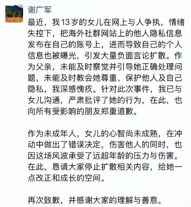 近日,有网友发帖称,有未成年人在网上参与了对一位孕妇的 " 开盒 ",造谣、曝光其工作单位并对其丈夫发去辱骂信息,只因该孕妇发表了对某韩国明星的评论。有网友指认称,参与 " 开盒 " 的未成年人为百度副总裁谢广军之女。随后,谢广军发朋友圈表示深感愧疚," 向所有受影响的朋友郑重道歉 "。