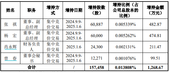 公司董事及副总经理张祺、董事及副总经理杨宏、财务负责人肖永辉、董秘曾春四人自2024年9月9日至2025年1月6日合计增持了公司股份15.75万股,占公司总股本0.013808%,增持金额合计1,268.67万元。由此可算得,高管增持每股均价为80.57元。与最新收盘价相比,这些高管股东们已账面浮盈约20%。