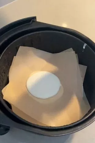 接下来,准备几张大小相等且适合空气炸锅形状的防油烤纸。把一张纸放在空气炸锅托盘的底部,把面糊舀到上面。一个有用的建议是把煎饼做得小一点,以免溢出来。