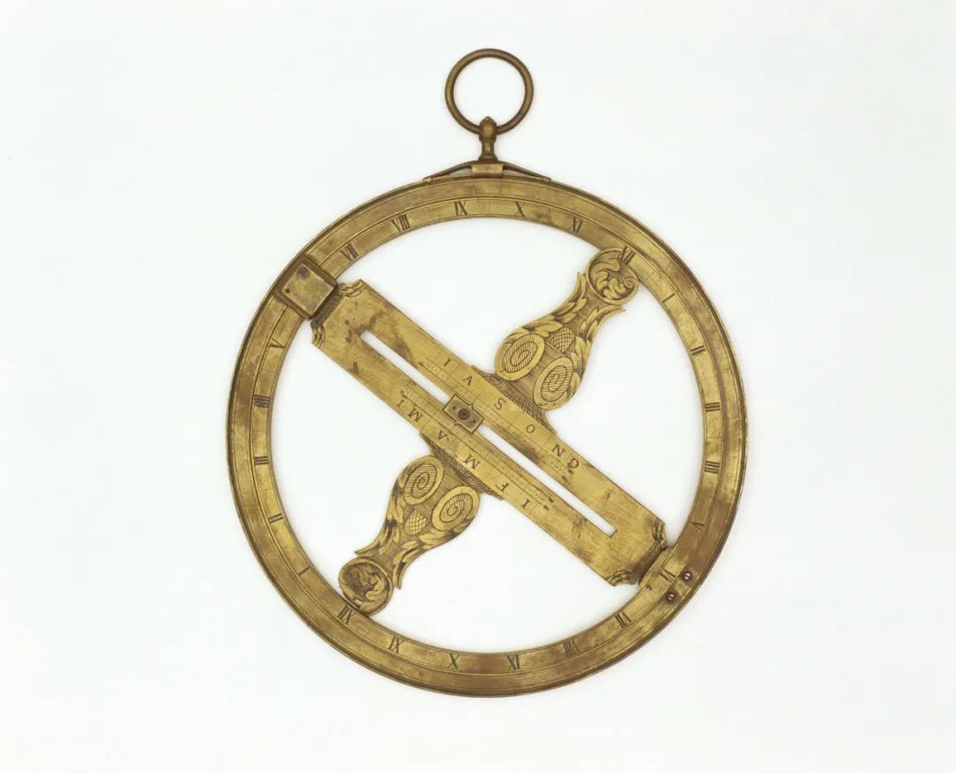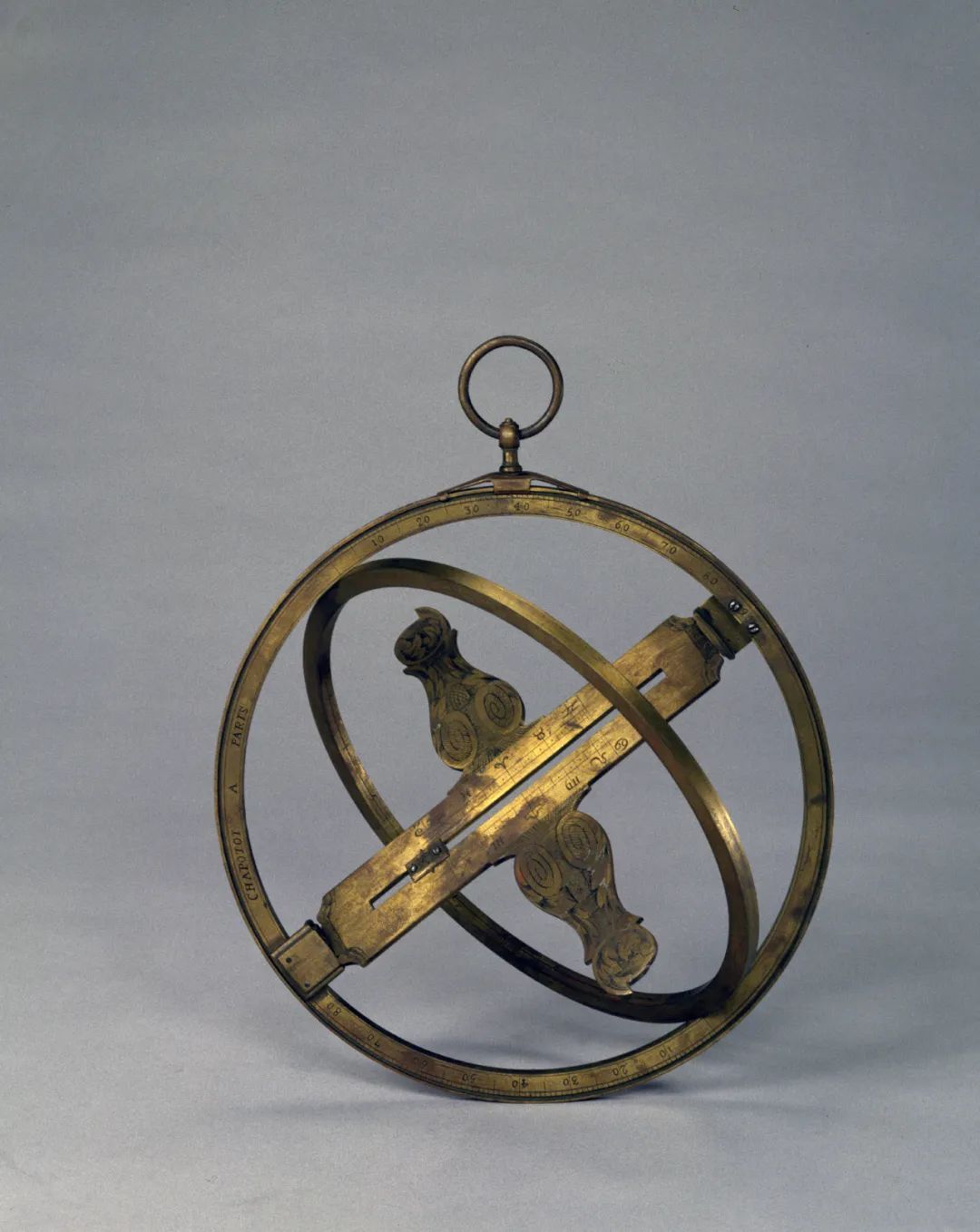 此件仪器分三重,由外向内分别是铜架、子午圈、赤道圈。测时间时,需要将提环固定在相应的纬度上,再将子午圈对正南北,直表、晷盘分别平行于赤道圈、赤道面,并令游标处于相应位置,根据透过游标上小孔的日光在晷盘上的投影知晓时刻。
