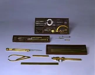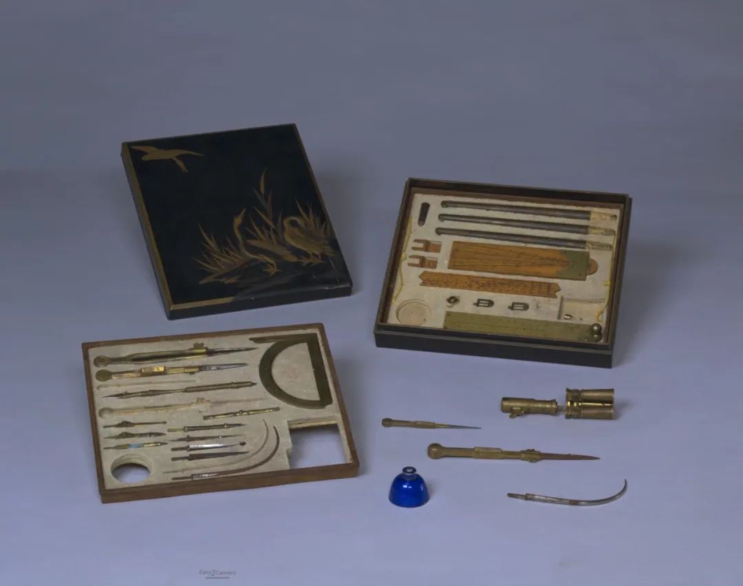 内含三个木匣,存放有铜镀金卡钳、铜镀金卡尺、铜镀金计算尺、圆规等二十余件绘图仪器。