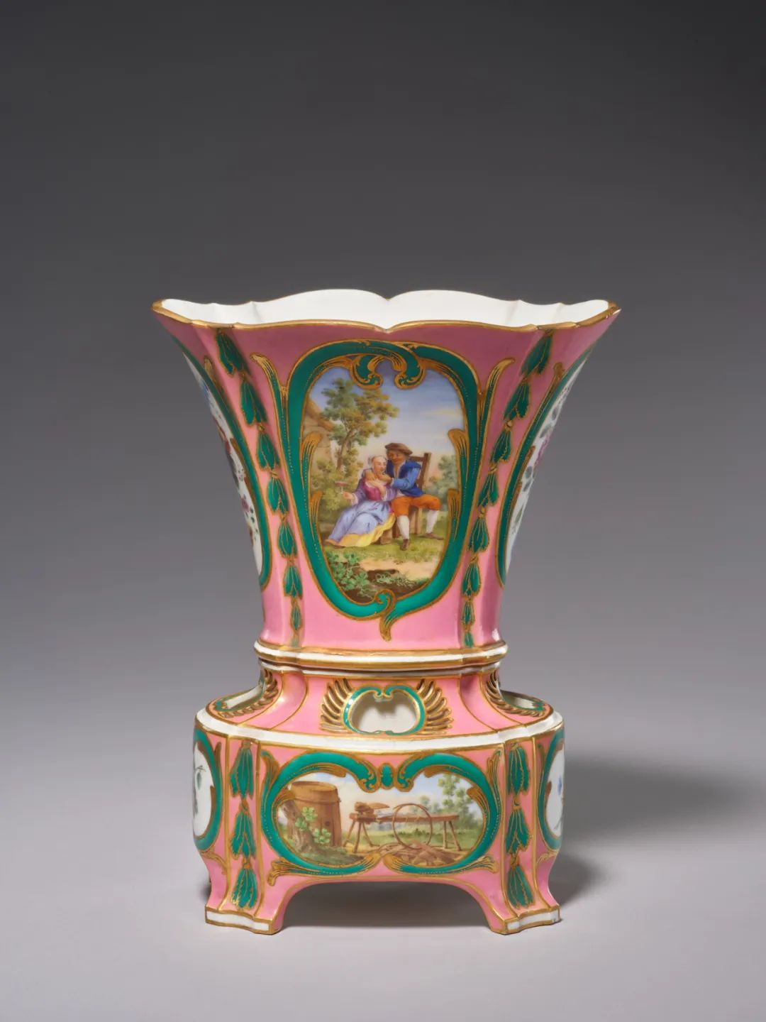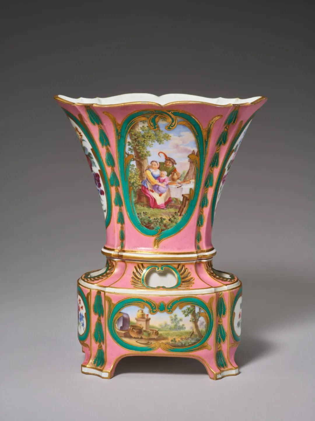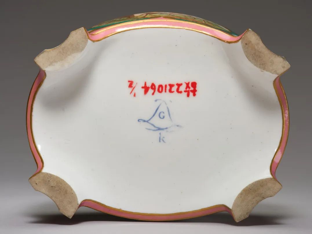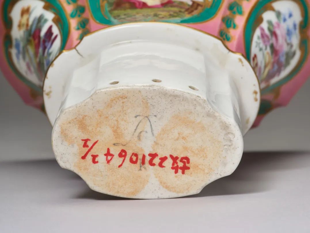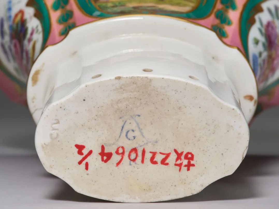 这种造型的花瓶被称为荷兰花瓶(Vase hollandois),是塞弗尔皇家瓷器厂最受欢迎的造型之一。两件花瓶的主题图案,是模仿十七世纪佛兰德斯画家特尼尔斯(David Teniers II)的绘画风格,绘制的是田园风光图案。底款为塞弗尔皇家瓷器厂的标识——两个蓝色交叉花体字母“L”,中间有代表生产年份的字母“G”,下部有画工签名“K”,底部的“cn”刻划符号,则是陶工的签名。