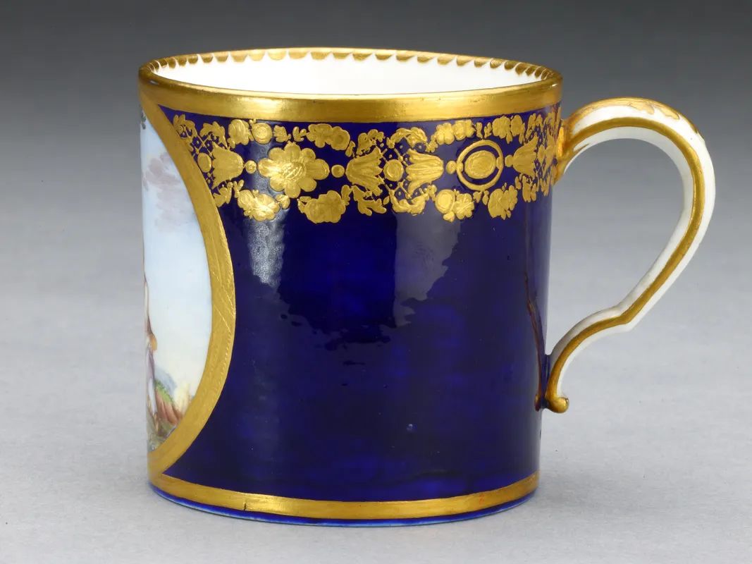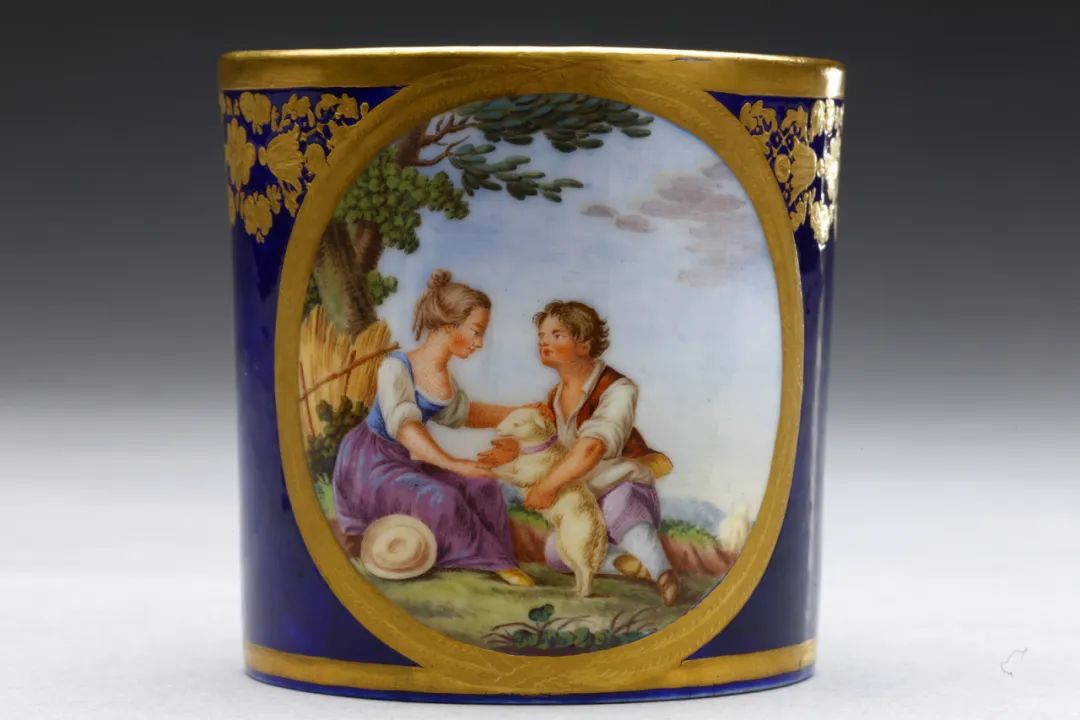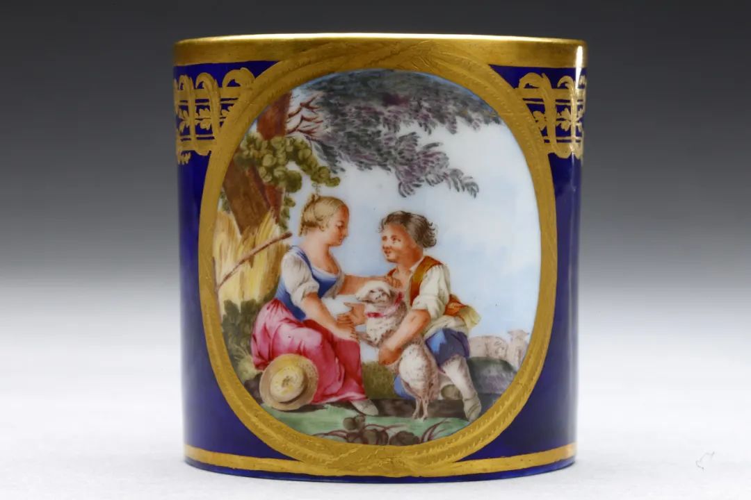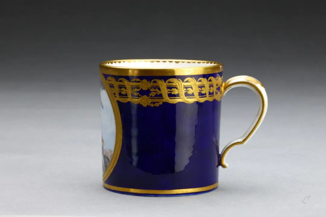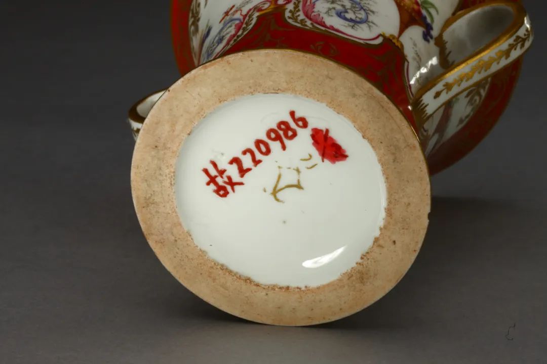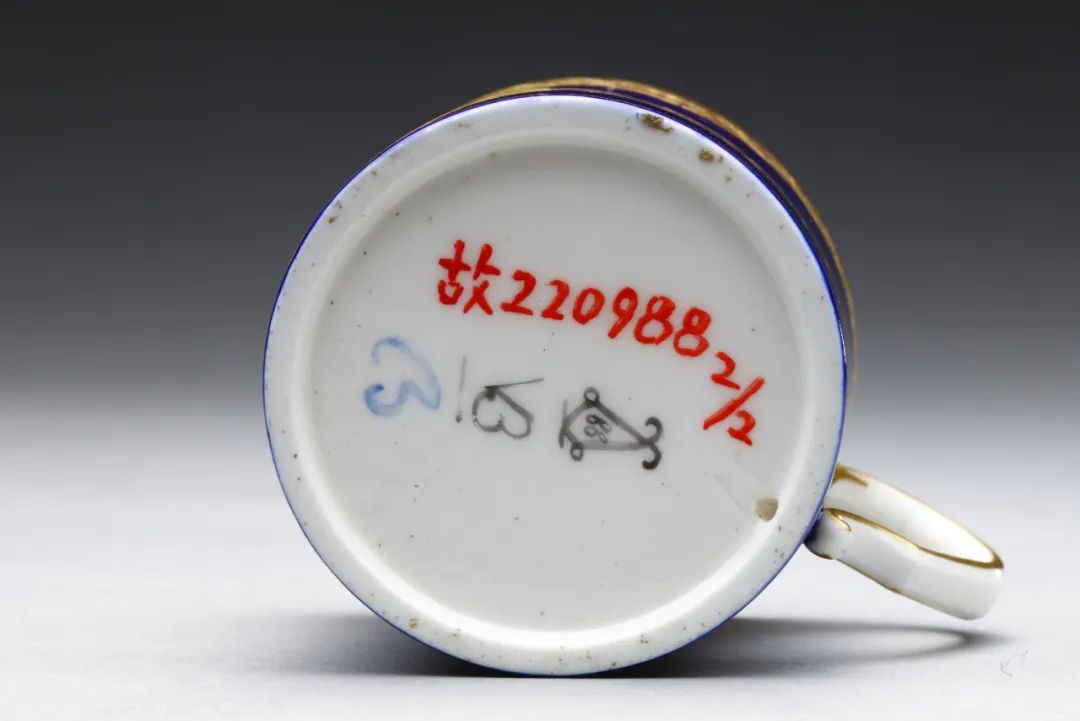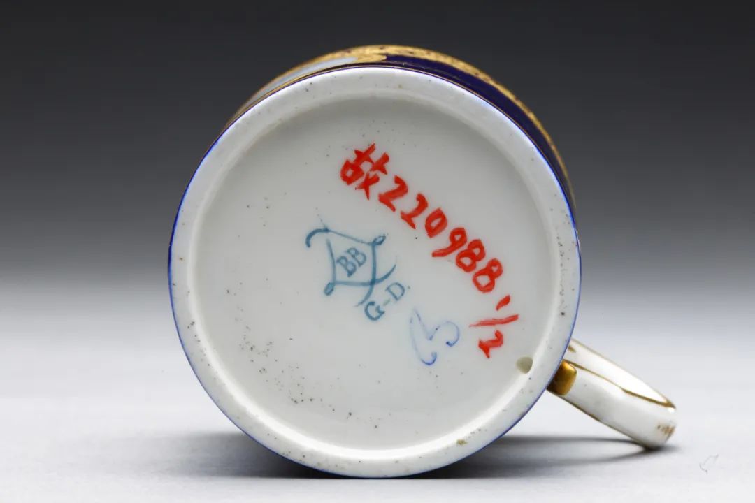 两件带柄杯的杯底均有塞弗尔皇家瓷器厂的双花体交叉“L”标识,之间有代表生产年份的两个字母“B”,“G-D”及蓝彩花押应为装饰工匠的签名标识。