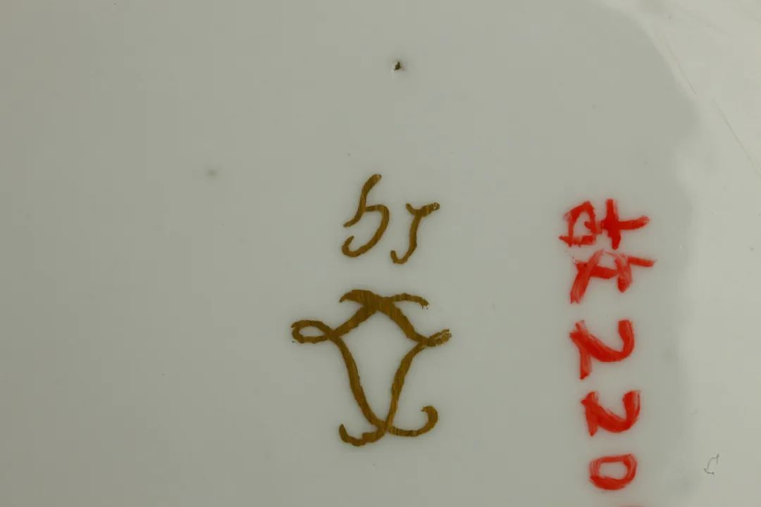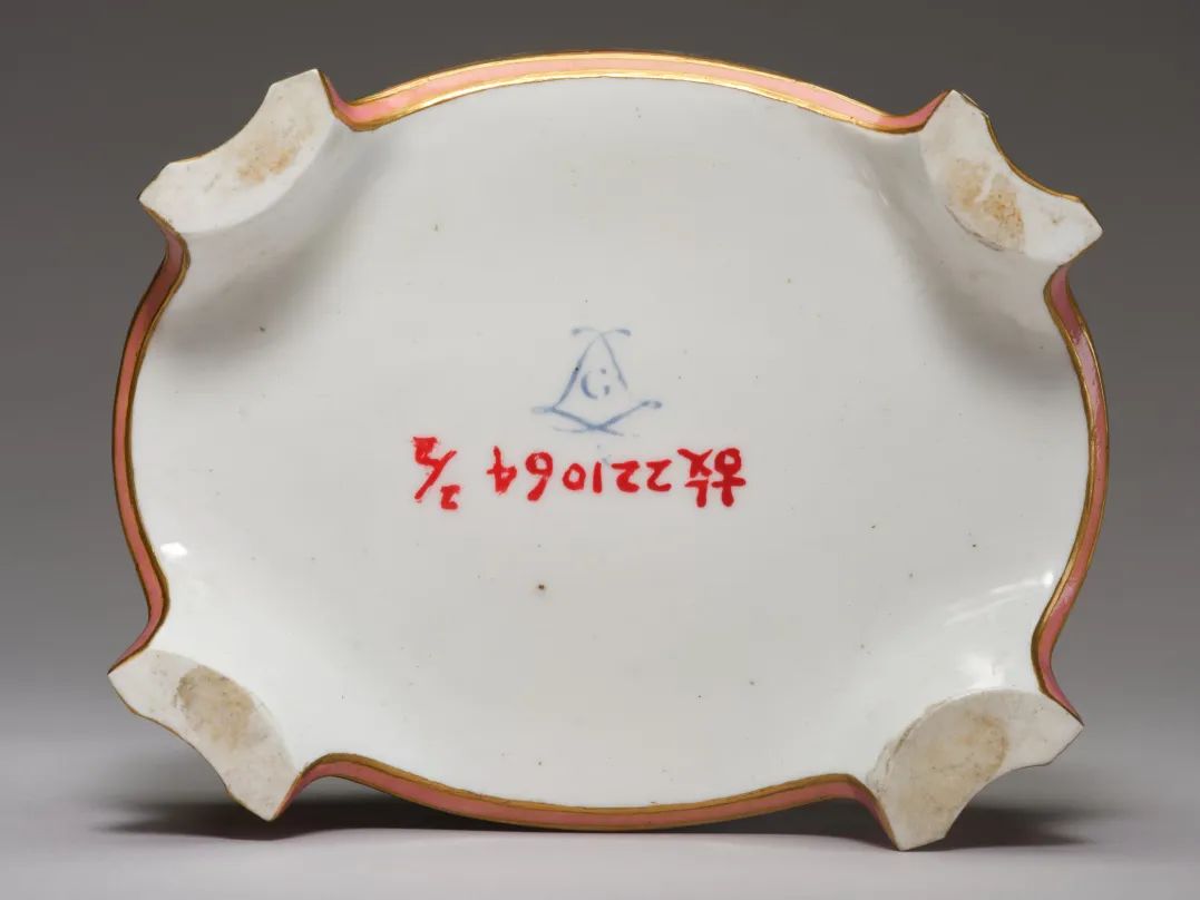 碟底绘有两个金色交叉花体字母“L”,从而判断此套杯碟由法国塞弗尔皇家瓷器厂烧造。金彩字母“LG”为描金工匠的签名标识。