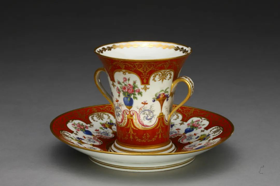 十八世纪 彩绘红地描金花卉纹双耳杯碟及杯底、碟底款识,杯高11.2厘米 口径10.3厘米 足径7.2厘米,碟高3.5厘米 口径19.5厘米 足径12厘米