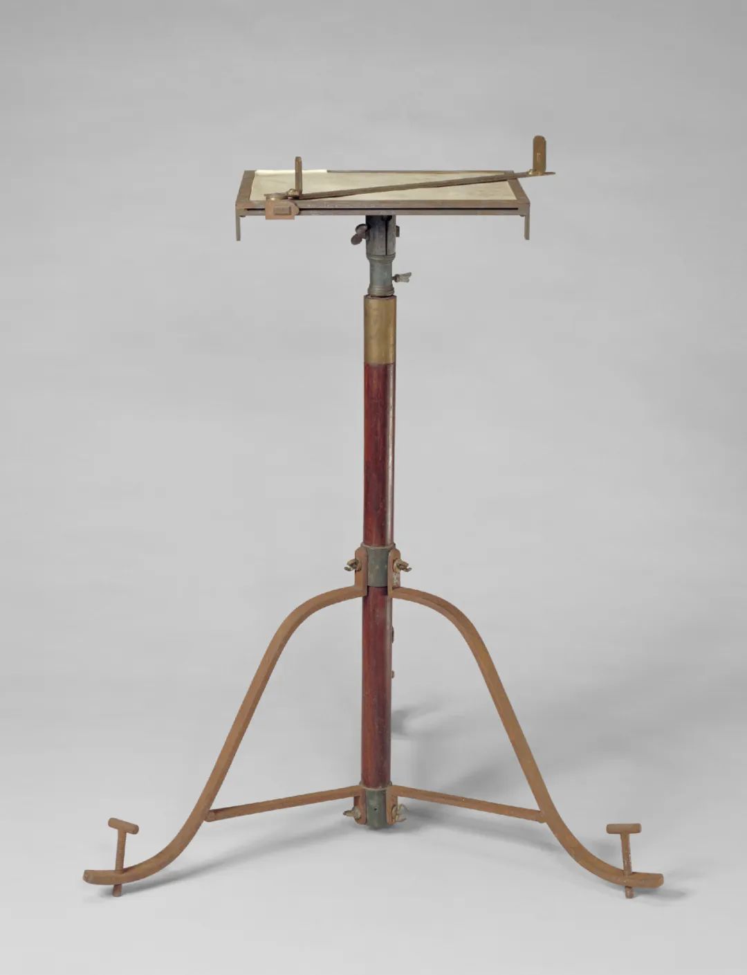 平板仪一侧两端各置立耳瞄准器,可作为定标,左下角置一活动游标,可以辅助画图。平板仪上夹有绘图纸,测量时可以边测边绘,便捷实用。