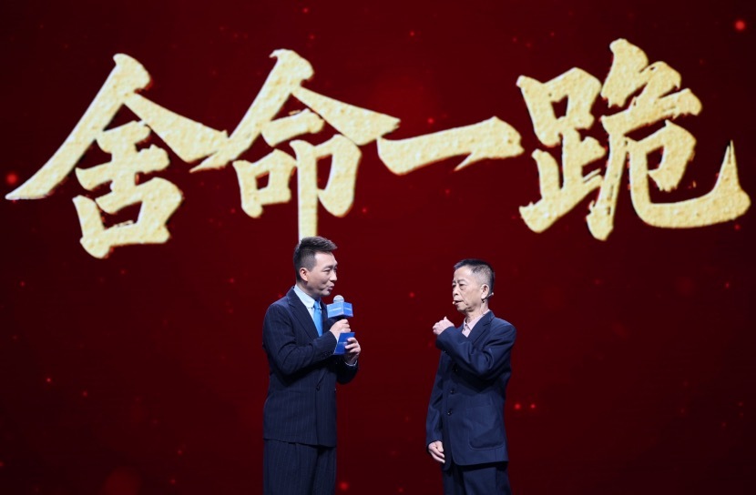 “舍命一跪”的黄建度在开幕式现场接受康辉采访。