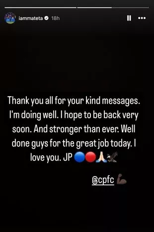 “他现在将在接下来的几天里休息和恢复,我们俱乐部的医生将密切关注他的进展。感谢塞尔赫斯特公园和医院的医务人员,感谢他们的帮助和专业精神,感谢今天JP和俱乐部收到的所有支持。”