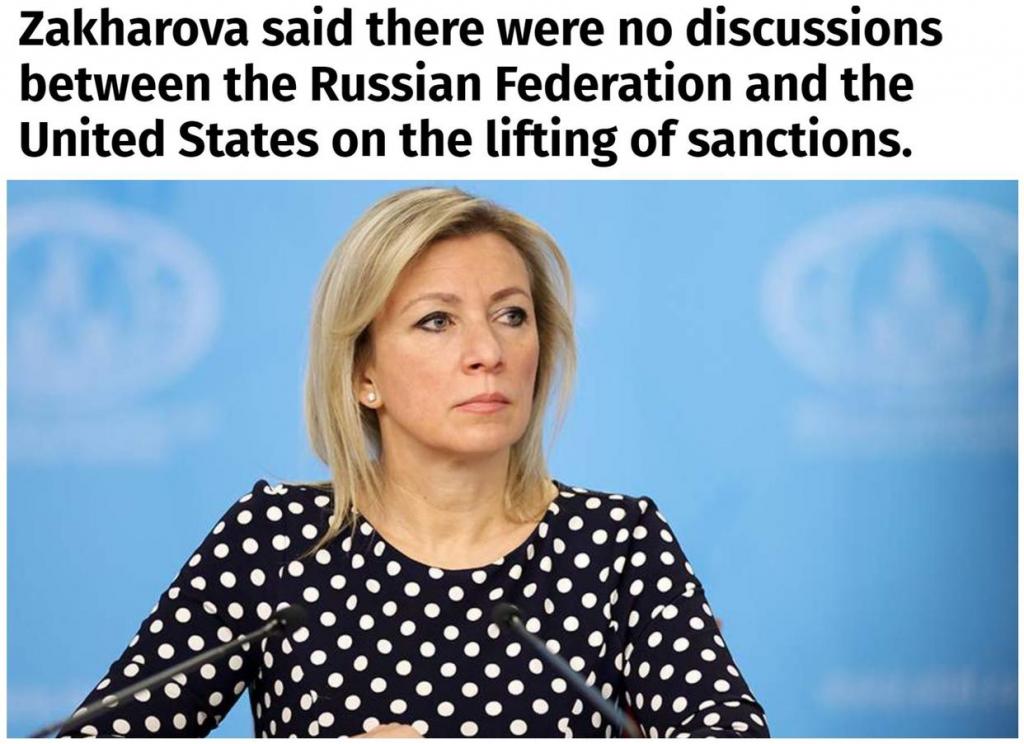 俄外交部发言人扎哈罗娃 6 日称,俄罗斯并未与美国就解除对俄制裁的问题进行讨论。她强调,制裁是具有破坏性和未经授权的。