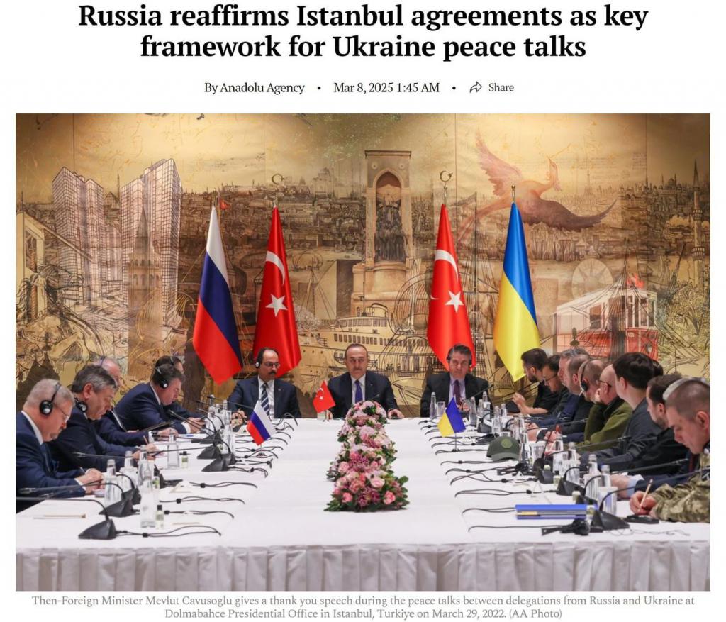 另据俄罗斯卫星通讯社 3 月 7 日报道,佩斯科夫表示,俄总统普京曾表示,俄乌冲突停火谈判可以以伊斯坦布尔协议草案为出发点。佩斯科夫称,俄方同样了解到,美方也认为伊斯坦布尔协议草案可成为谈判基础和起点。