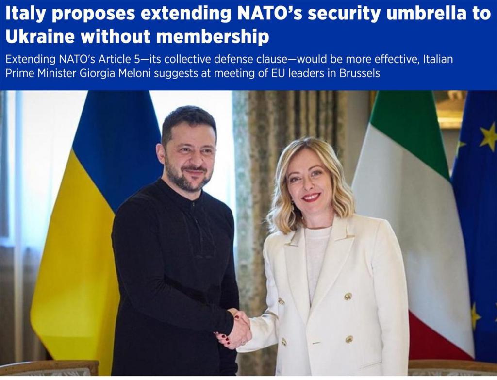 在不久前结束的欧盟特别峰会期间,意大利总理梅洛尼提议,让北约的集体防御条款适用于乌克兰。乌克兰外交部随后对此表示欢迎,称正在就更多细节与意大利接触。