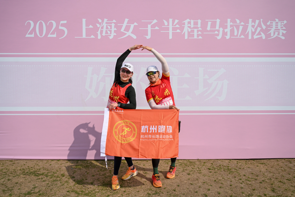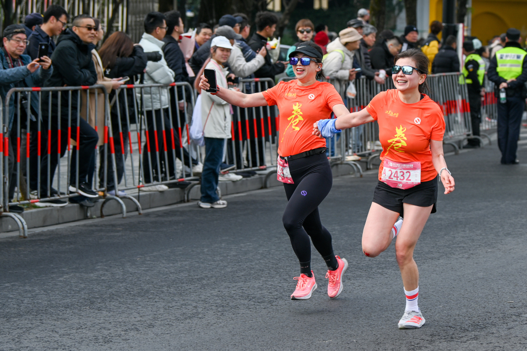 2025年3月9日,上海,赛后,来自杭州的陈晗(左)和朋友在拍照打卡。澎湃新闻记者 朱伟辉 图