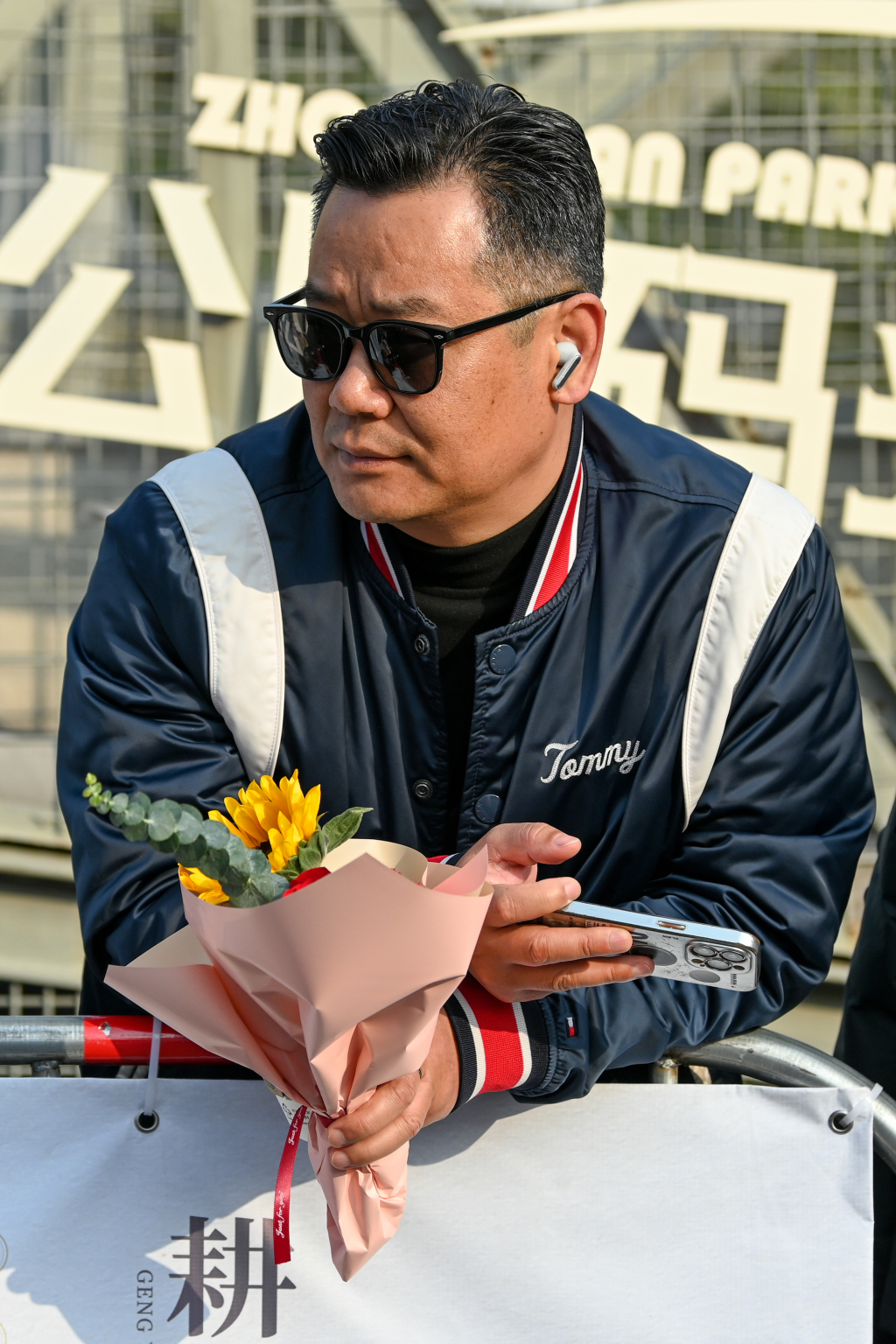 2025年3月9日,上海,王先生拿着鲜花,在终点处等候参加比赛的爱人“我爱人喜欢跑步,她参加比赛只要我有空都会过来陪她”。澎湃新闻记者 朱伟辉 图