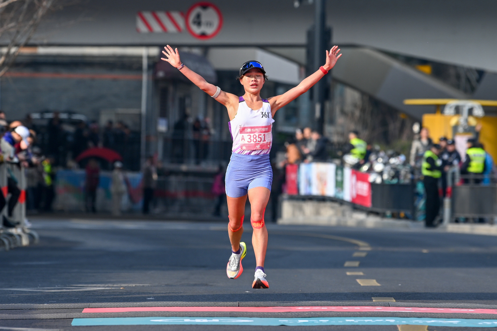 2025年3月9日,上海,选手挥着双手冲过终点。澎湃新闻记者 朱伟辉 图