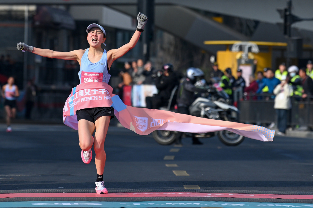 2025年3月9日,上海,赵艳丽以1小时15分49秒的成绩第一个冲过终点线。澎湃新闻记者 朱伟辉 图