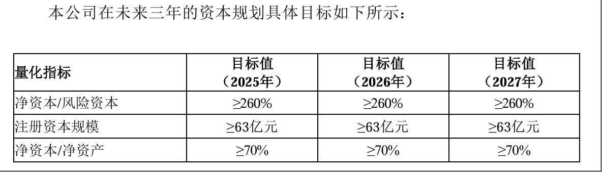 公司《未来三年资本管理及使用规划(2025 年-2027 年)》(下称:《三年规划》)显示,陕国投A力争在2025年将注册资本提升至最低63亿元。同时,净资本/风险资本指标最低要求260%,净资本/净资产最低要求70%。
