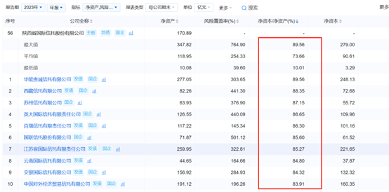 界面新闻记者发现,按照企业预警通披露的2023年末有数据展示的信托机构“净资本/风险资本(风险覆盖率)”、“净资本/净资产”数据(母公司报表)来看,陕国投A未来三年力争达到的两项指标水平在业内处于中等水平。