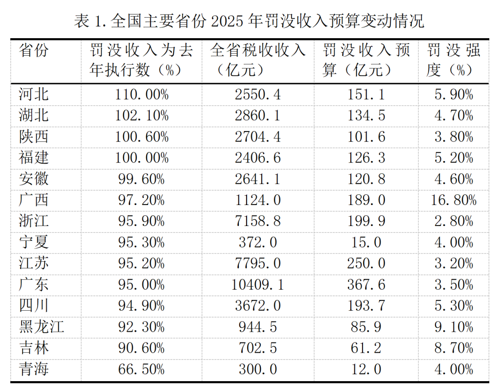 2025年全国罚没收入降幅基准线在5%左右。2025年,中央罚没收入预算220亿,较2024年执行数减少6.6%。在目前公布全罚没数据的14个省份中,2025年罚没收入预算平均为2024年执行数的95.40%(表1)。