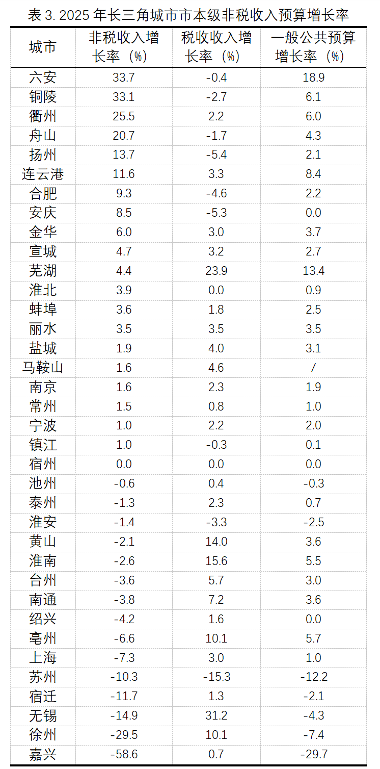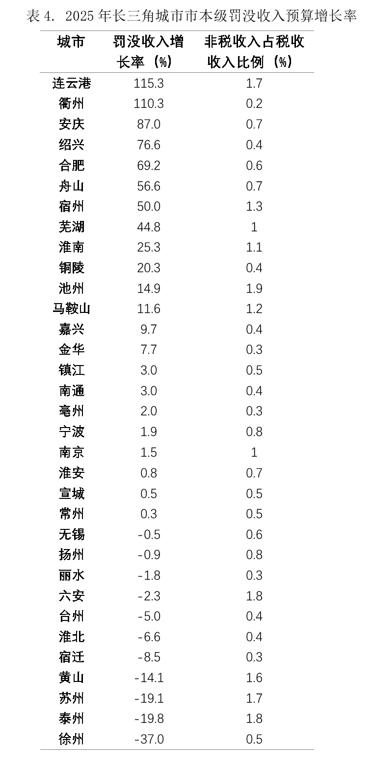 在税基萎缩、支出刚性的情况下,征收非税常被作为救急之策。而在非税收入中,罚没收入征收较灵活,常常作为维持财政收支平衡的着手对象。在2025年非税收入预算增长的21个长三角城市中,17个城市罚没收入同步增长,其中12个城市罚没收入在非税收入项目中增长最快。
