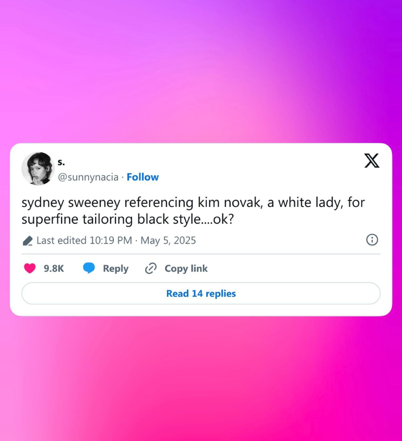 X(前身为Twitter)上的批评人士迅速做出了尖锐的反应。一位用户嘲笑道:“Sydney Sweeney引用了Kim Novak,一位白人女士,为Superfine剪裁黑色风格....好吗?,而另一个人则反驳道,“主题是剪裁黑人风格,却向白人女士致敬。”