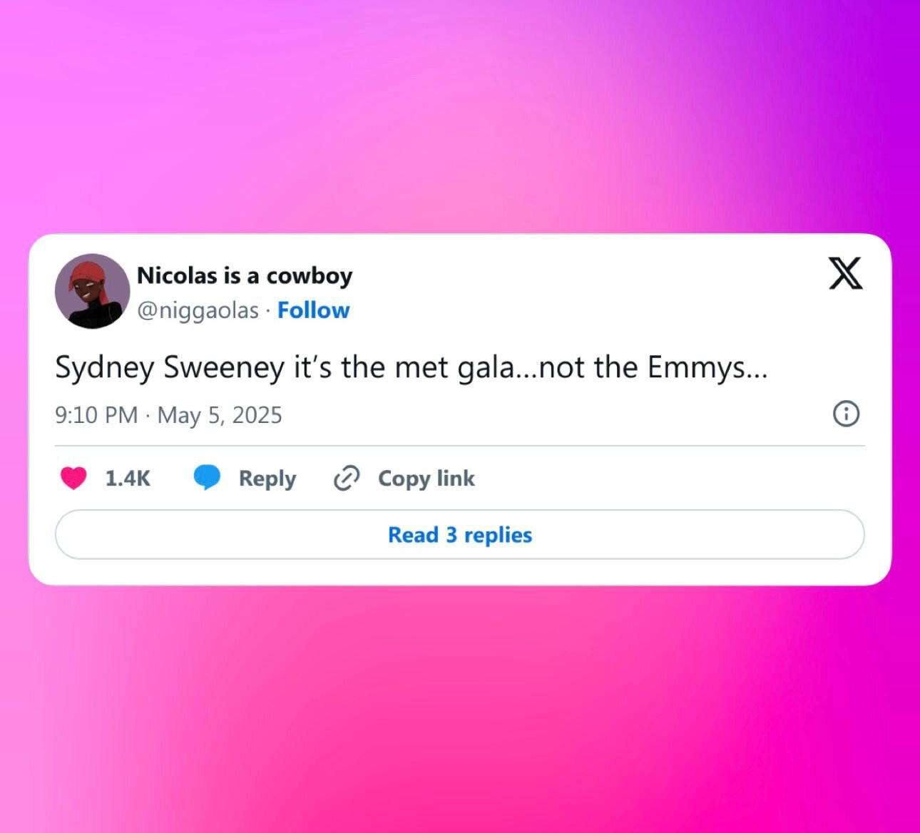 “女演员西德尼·斯威尼看起来像是要去白宫记者晚宴,而不是大都会艺术博物馆慈善晚会。# MetGala2025”