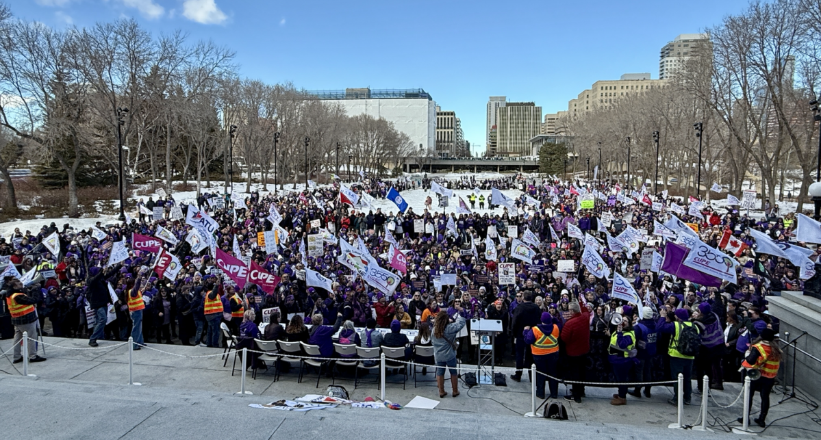 在预算日,数百名罢工的学校支持工人穿过埃德蒙顿市中心的街道,游行到阿尔伯塔省立法机构,站在外面,挥舞标语,吹喇叭,要求提高工资。