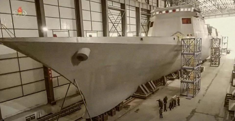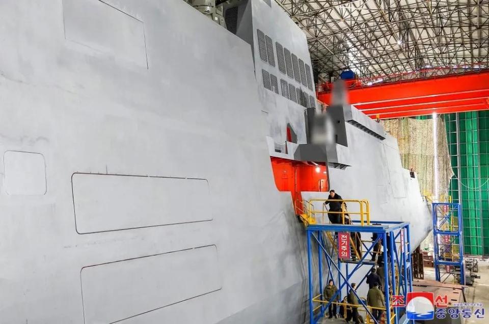 咱们还是先看看这艘朝鲜的 " 盾舰 " 吧,从去年年底朝鲜中央电视台公开的画面看,朝鲜领导人金正恩在 2024 年,起码去过两次新浦造船厂,视察该舰的建造情况。
