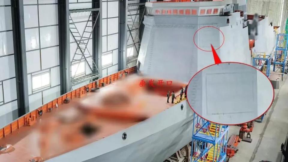 首先是位于舰桥上的相控阵雷达安装位置已经被封闭上了。当然,这并不意味着相控阵雷达已经装舰。毕竟作为安装精度要求极高的舰载设备,相控阵雷达一般需要等待舰体下水之后,在水中进行充分的应力释放后,才能开始安装。现在只是暂时用一块蒙皮把相控阵雷达安装部位掩盖起来,以避免其后台已经安装的伺服系统等受水汽、盐雾等影响。这也是该舰距离下水更近一步的一个特征。