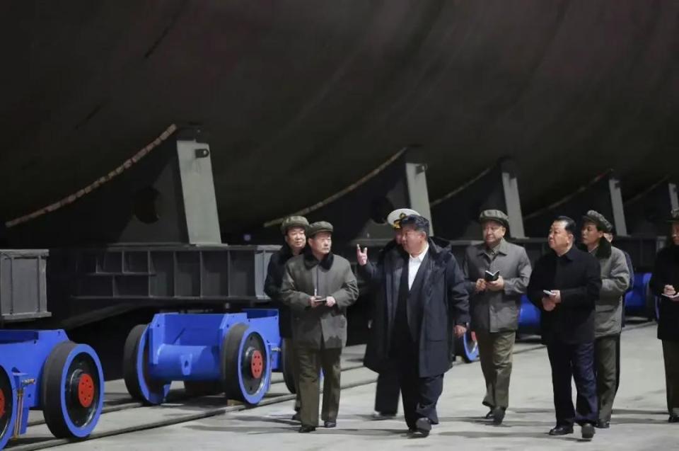 除了检查该型防空舰的建造,朝中社特别提出,朝鲜领导人金正恩随后还检查了朝鲜核动力战略导弹潜艇的建造工作,甚至还专门配了一张新闻图片。图片中,金正恩正走过一段室内船台,而在他和随同的工作人员背后,则是一条 " 大黑鱼 ",可以清楚地看到潜艇的圆柱状艇体。