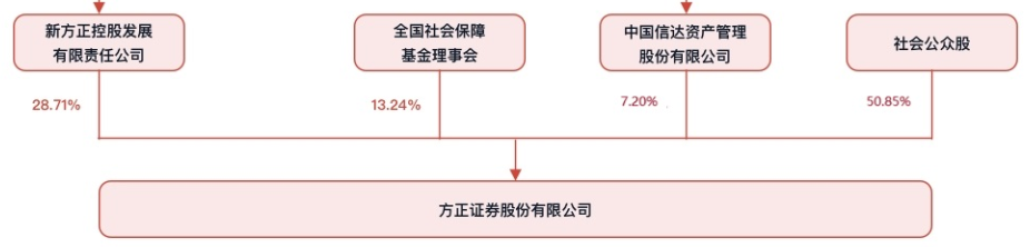 官网资料显示,目前,方正证券持股比例在5%以上的股东共有3家,分别为新方正控股发展有限责任公司、全国社会保障基金理事会、中国信达资产管理股份有限公司,持股比例分别为28.71%、13.24%和7.20%。