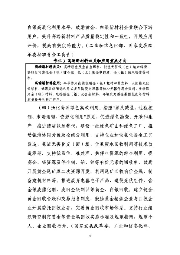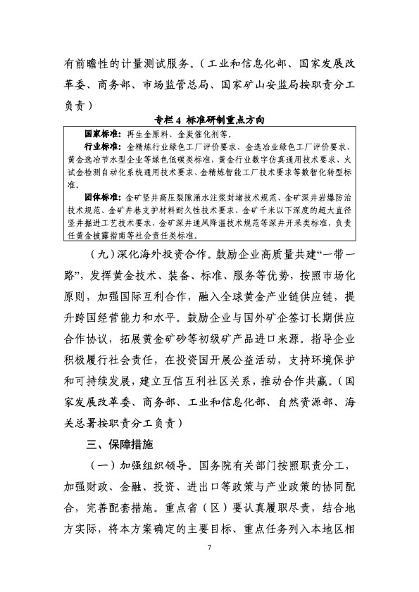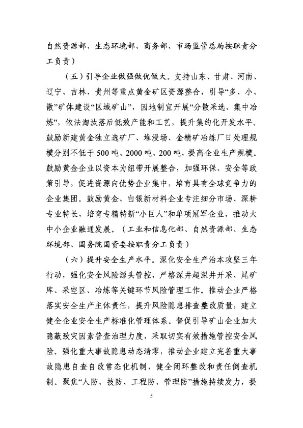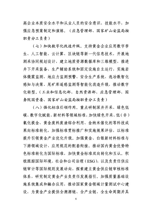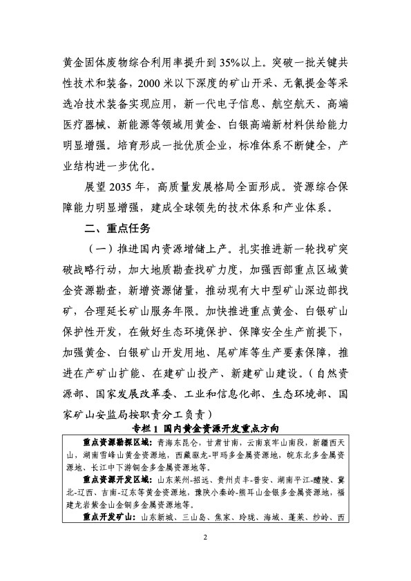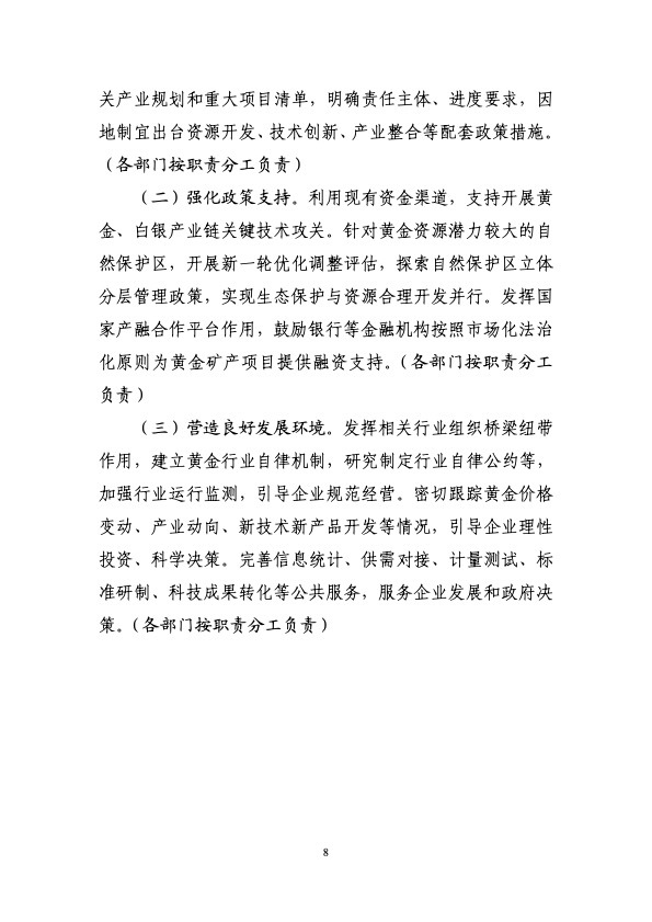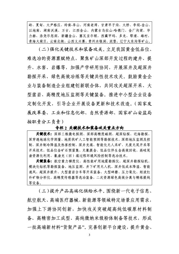 工业和信息化部等九部门印发《黄金产业高质量发展实施方案(2025—2027年)》。《实施方案》提出,到2027年,黄金资源保障能力和产业链创新水平明显提升。资源保障方面,黄金资源量增长5%-10%,黄金、白银产量增长5%以上;技术创新方面,突破一批关键共性技术和装备,2000米以下深度的矿山开采、无氰提金等采选冶技术装备实现应用,黄金、白银高端新材料供给能力明显增强;产业升级方面,黄金矿石处理量500吨/日以上的矿山产量占全国70%以上,培育一批优质企业,标准体系不断健全,产业结构进一步优化。展望2035年,高质量发展格局全面形成,资源综合保障能力明显增强,建成全球领先的技术体系和产业体系。