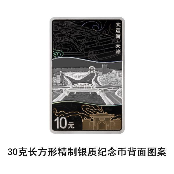 30克长方形银质纪念币背面图案以天津三岔河口为主要场景,衬以杨柳青镇、天津天后宫、三岔河口古地图等,并刊“大运河·天津”字样及面额。