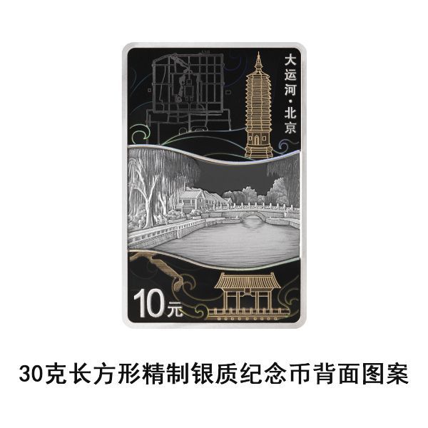 30克长方形银质纪念币背面图案以北京什刹海万宁桥为主要场景,衬以白浮泉、元代积水潭略图、燃灯塔、明清北京城平面图等,并刊“大运河·北京”字样及面额。