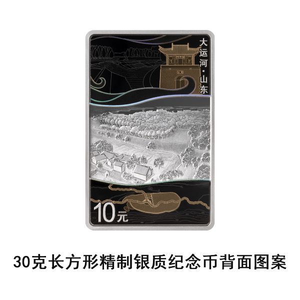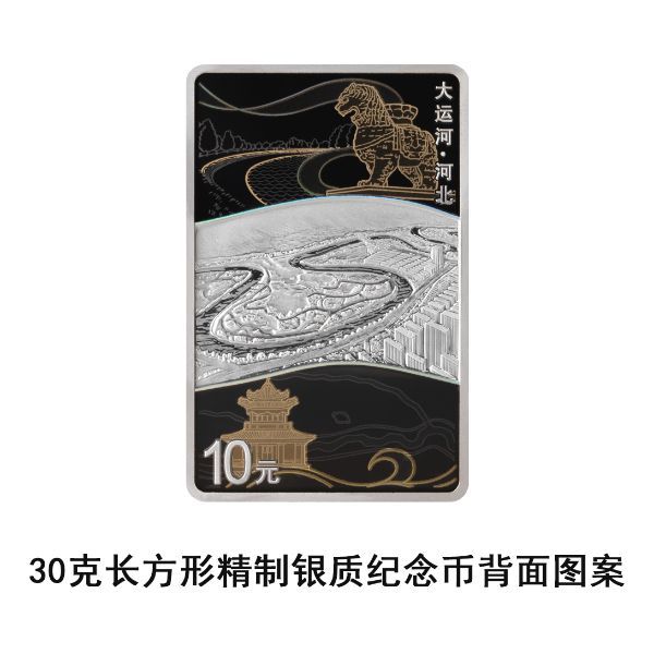 30克长方形银质纪念币背面图案以河北沧州运河为主要场景,衬以沧州铁狮子、连镇谢家坝、泊头清真寺、沧州运河古地图等,并刊“大运河·河北”字样及面额。