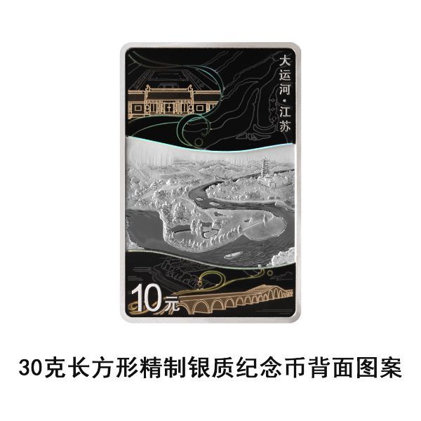 30克长方形银质纪念币背面图案以江苏扬州运河三湾段、扬州中国大运河博物馆为主要场景,衬以淮安总督漕运公署遗址、洪泽湖大堤、苏州宝带桥、清口水利枢纽古地图等,并刊“大运河·江苏”字样及面额。